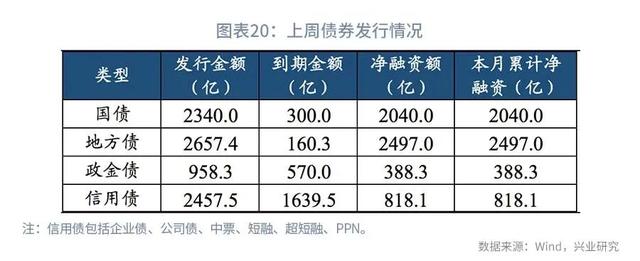 从债券发行来看,上周国债发行2340亿元,到期 300亿元,净融资2040亿元;地方债发行2657.4亿元,到期 160.3亿元,净融资 2497.0亿元;政金债发行958.3亿元,到期 570亿元,净融资 388.3亿元;信用债发行2457.5亿元,到期 1639.5亿元,净融资 818.1亿元。