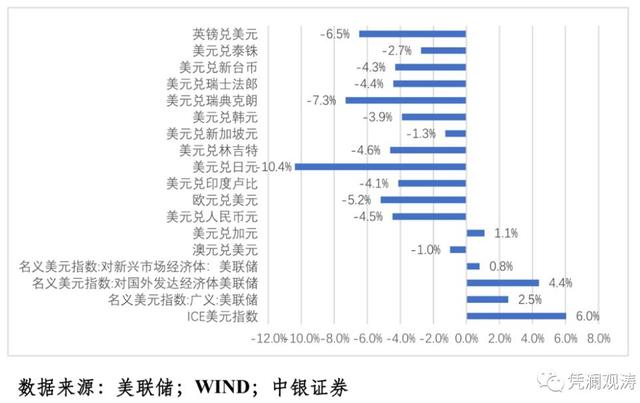 图2:2022年前5个月美元指数及美元兑主要货币的汇率变动(单位:%)
