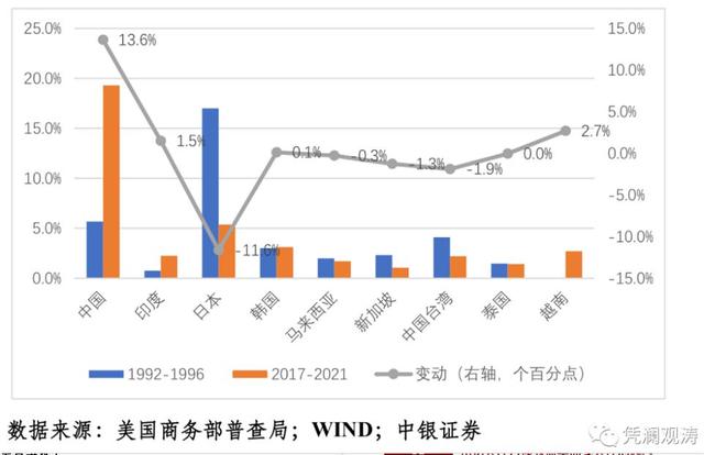 图7:美国商品进口中的亚洲经济体占比及其变动(单位:%;个百分点)