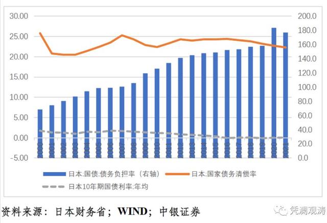 图9:日本国家债务负担和10年期日本国债收益率(单位:%)