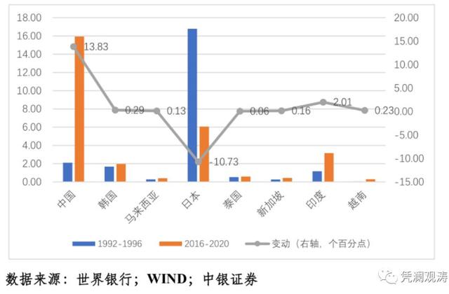图4:部分亚洲经济体占全球GDP比重及其变动(单位:%;个百分点)