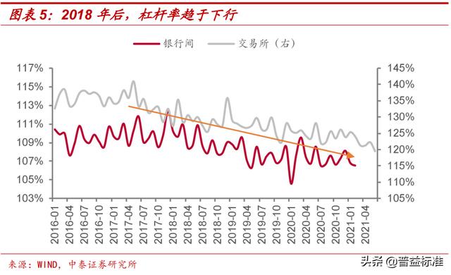 2018年后,杠杆率整体呈现震荡下行走势。2018年之前,银行间杠杆率较高,整体维持在107%-113%区间,2017年12月是近几年峰值,达到112.5%。2018年之后,在“金融去杠杆”政策导向下,银行间杠杆率出现回落,2021年2月杠杆率为106.6%,处于历史低位。与银行间市场类似,近年交易所杠杆率同样处于下行通道,有所不同的是交易所杠杆率显著高于银行间杠杆率。2020年至今,交易所杠杆率位于120%-130%区间,主要原因是交易所市场的投资者以保险机构、广义基金、证券公司等非银机构为主,其偏高主要是受到证券公司和广义基金杠杆率偏高的拉动。