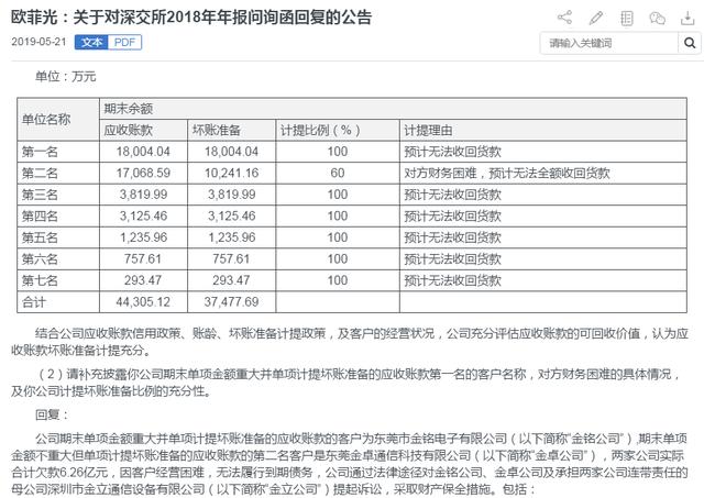 又是一只知名度很高的白马股——欧菲光,因为金立手机的破产,造成应收账款的重大减值,利润暴跌,直接对该公司的股价造成毁灭性打击。