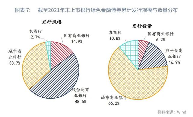 从发行主体类型来看,上市银行发行的绿色金融债券中,股份行发行规模领先,城商行发行数量领先。上市银行中股份制商业银行和城市商业银行在绿色金融债券发行方面占据主导地位,在发行规模方面,截至2021年末,上市股份制商业银行累计发行绿色金融债券规模1950亿元,占上市银行发行总额48.6%,排在首位,其次为城市商业银行,累计发行规模1355亿元,占比33.7%。在发行数量方面,截至2021年末,上市城市商业银行累计发行绿色金融债券数量为43只,占上市银行发行总数量的66.2%,排在首位,其次为股份制商业银行,累计发行11只,占比16.9%。