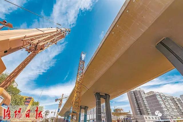 该立交桥全桥桥跨结构为钢箱梁,共13联38跨,总重16000吨,架设高度4.5米~17.9米,其中,桥梁高墩高达15.5米。高墩安装结束标志着该工程一个重要建设节点完成。(洛阳日报记者 刘冰 通讯员 王焕 摄)