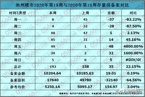 (一)2020年第19周池州楼市存量房备案193套,与上周(158套)相比增加35套,环比上升22.15%;