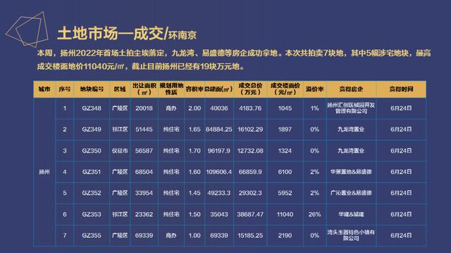 本周,扬州2022年首场土拍尘埃落定,九龙湾、易盛德等房企成功拿地。本次共拍卖7块地,其中5幅涉宅地块,最高成交楼面地价11040元/㎡,目前扬州已经有19块万元地。