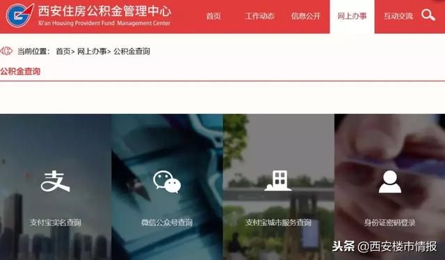 登录西安住房公积金管理中心官网(网址:http://zfgjj.xa.gov.cn/index.htm),进入“首页—点击公积金查询”可以看到支付宝、微信公众号、支付宝城市服务、身份证密码登录这四种方式来查询自己缴纳的公积金余额。
