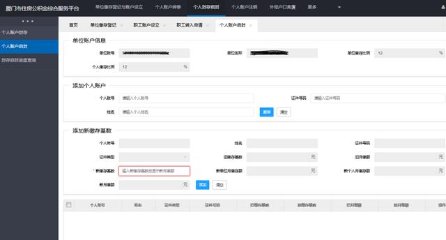 输入职工身份证号或个人账号后按【添加】,即可出现该职工的相关信息 ,确认信息无误后点击右上角【提交】,即可申请转入该员工公积金账户。