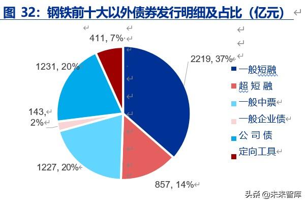 中小钢企更倾向于发行公司债,负债率较高的钢企无论大小都会使用定向工具融资。这种差异是因为短期融资券和中票等融资工具的审批权限已从人民银行下放至中国银行间市场交易商协会,而交易商协会采取注册制,且对募集资金用途并无强制要求,因此有条件的企业一般会更倾向于通过交易商协会发行融资工具进行融资,这是普遍现象。2012 年 5 月中小企业私募债的推出和 2015 年 1 月“新版公司债”面世, 使得更多的中小微型企业和非上市公司也可以发行公司债,而这类企业在交易商协会的注册难度要大于龙头企业,因此前十以外的钢铁企业公司债发行量占比相对较高。定向工具同样是主要面向中小微企业的融资工具,不过由于定向工具规模可突破净资产 40%的限制,因此负债率较高的大型企业同样会选择定向工具进行融资。
