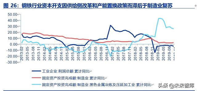 第三个小高峰提前的原因是供给侧改革和产能置换政策导致的行业资本开支时间后移。2016 年国内经济开始复苏,企业经营状况改善,盈利回升,制造业投资增速从 2016 年 9 月开始拐头向上。钢铁行业资本开支在 2016 年上半年有小幅增长, 但随后在供给侧改革的大背景下,行业开始去产能、降杠杆并且禁止新增产能,资本开支增速快速回落,绝大部分用于环保升级、生产线技改和日常设备维护。2017 年12 月 31 日工信部对原产能置换办法进行修订,出台了《钢铁行业产能置换实施办法》。2018 年开始大量产能置换项目上报,据 Mysteel 不完全统计,2018-2019 年各省市合计公告/公示产能置换项目 119 个,涉及新建炼钢产能 18703 万吨,退出炼钢产能 21967 万吨。经过 2016-2017 年盈利能力恢复和资产负债表改善, 在大量新建项目的刺激下,钢铁企业资本开支和融资需求均大幅增长。