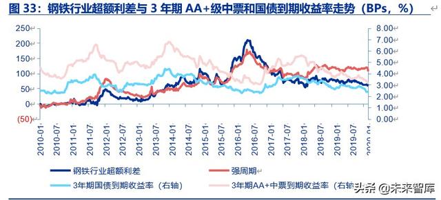 2014 年 12 月至 2015 年 8 月,钢铁行业利差震荡下行 54BPs。这一阶段钢铁行业超额利差整体震荡下行,但节奏上与行业盈利水平存在较明显的负相关关系。整体下行趋势的原因我们认为是低利率导致资金增配信用债套息,带动信用债整体利差下行。