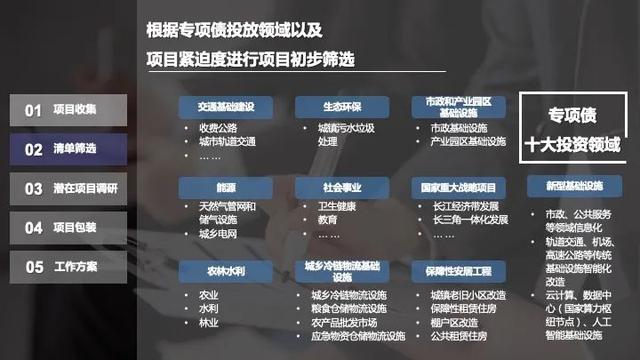 第二步,根据专项债投放领域以及项目紧迫度进行项目初步筛选。根据最新政策要求,专项债重点支持领域包括:交通基础设施、能源、农林水利、生态环保、社会事业、城乡冷链等物流基础设施、市政和产业园区基础设施、国家重大战略项目、保障性安居工程、新型基础设施此十大领域。