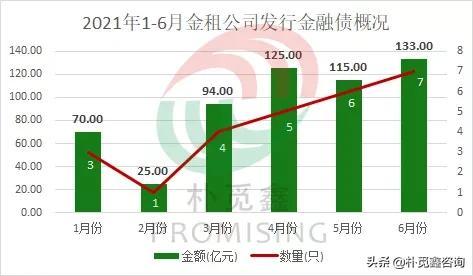 从发行时间来看,除2月份外,金租公司发行金融债的数量随着时间的推移呈逐渐上涨的趋势,且4-6月份发行金融债总额均超过了100亿。6月份金融债发行数量最多,共发行7只金融债,总金额高达133亿。