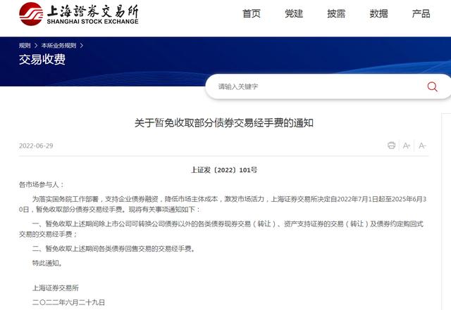 6月29日,上海证券交易所发布《关于暂免收取部分债券交易经手费的通知》。其中明确,上海证券交易所决定自2022年7月1日起至2025年6月30日,暂免收取部分债券交易经手费。