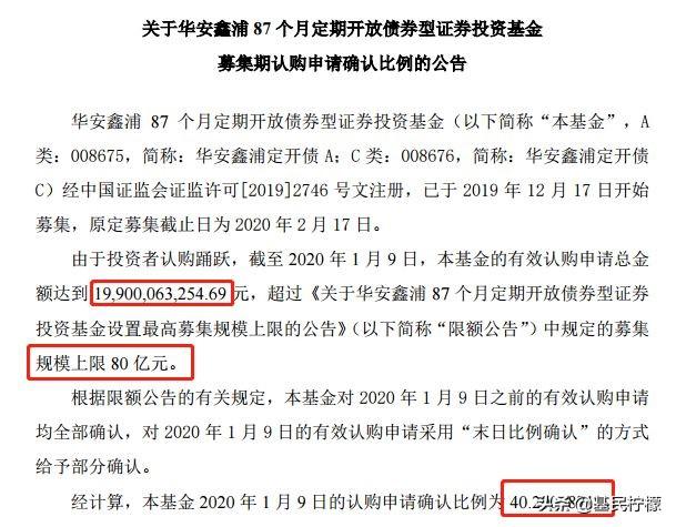 华安鑫浦87个月定期开放债券基金,原定募集截止日为2020年2月17日。由于投资者认购踊跃,截至2020年1月9日,该基金认购总金额达到 19,900,063,254.69 元,超过募集规模上限80亿元。该基金只好对9日的有效认购申请采用“末日比例确认”的方式给予部分确认。经计算确认比例为40.2006871%。