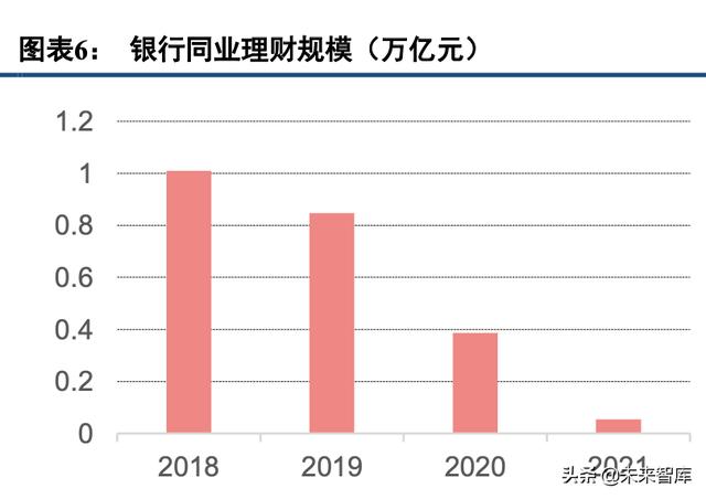 资管新规发布后资管行业缩量的逻辑主要在于不符规定的保本、预期收益及通道产品业务规模的调整。资 管新规要求打破刚性兑付,强调“卖者尽责、买者自负”,明确了刚性兑付的行为;资管产品净值化转型;以及 要求消除多层嵌套和通道业务。在此背景下,原有银行理财 4 万亿的保本型产品至 2021 年末被压降至 0,同业 理财压降至 541 亿元,非净值型产品规模占比减少至 7%,基金专户、券商的定向资管以及单一资金信托规模也 得到了持续的压降,自 2017 年至 2021 年分别减少了 46%、72%、63%。