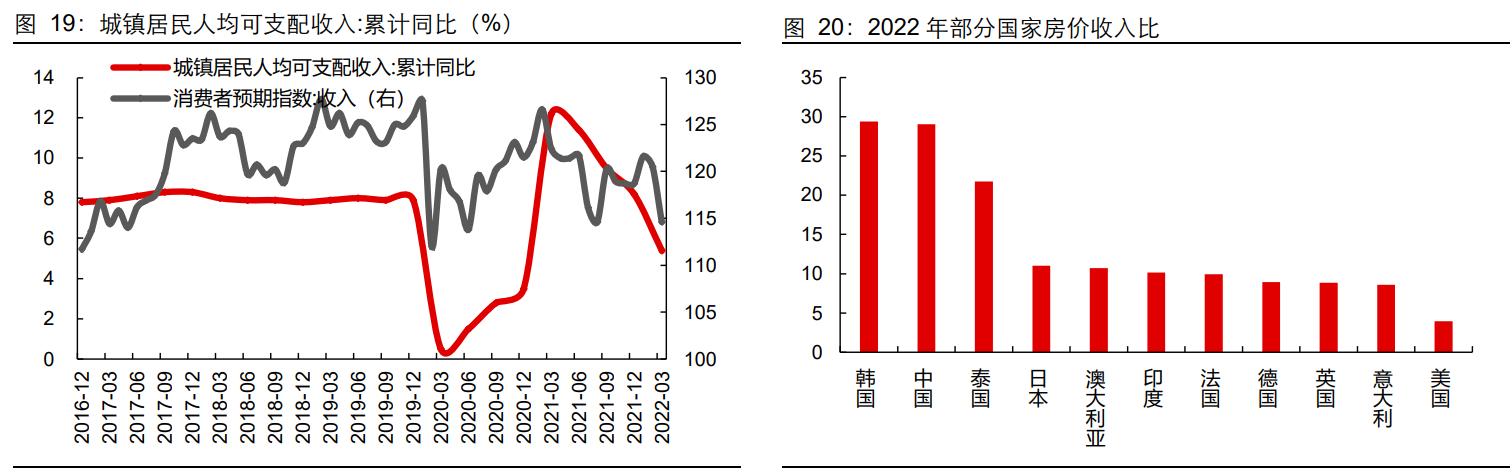 线索五:居民购买力出现大幅下降。从价格角度来看,无论是与美日德等发达国家还是泰国、俄罗斯等发展中国家相比,中国的房价收入比均处于世界较高水平;而受疫情等因素影响,居民购买力却处于下行通道。