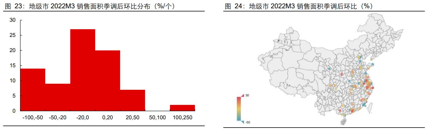 从区域销售情况来看,超六成城市 3 月下滑销售面积季调后环比下降,主要分布在江苏、 广东等省份。79 个有统计 2022 年 3 月销售面积季调环比数据的城市中,49 个城市 2022M3 销售面积季调后环比下降,占比 62%,其中降幅超过 50%的城市占比接近 2 成。