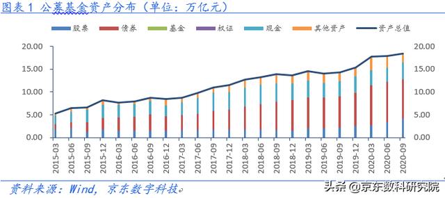 一、公募基金资产配置按照资产类型,2020年三季度末,公募基金资产总值为18.5万亿元,较年初增加了3.15万亿,,季度新增规模分别为2.5万亿、0.06万亿和0.59万亿,;资产净值17.07万亿,较年初增加了2.97万亿;债券资产的总市值为8.6万亿,较年初增加了1.2万亿;股票资产的总市值为4.16万亿,较年初增加了1.6万亿;三季度,公募基金环比减持债券资产0.34万亿,增持股票资产0.8万亿,增持现金资产0.63万亿;季末公募基金债券资产合计占比为46.4%,股票资产的占比为22.53%。