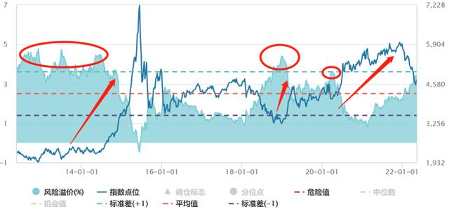 均值之上1倍标准差是3.6%,算是相对高位的水平,代表股票的性价比较高,应该买入股票;而均值之下1倍标准差是1.4%,代表此时股票的吸引力下降,可以考虑卖出股票买入债券。