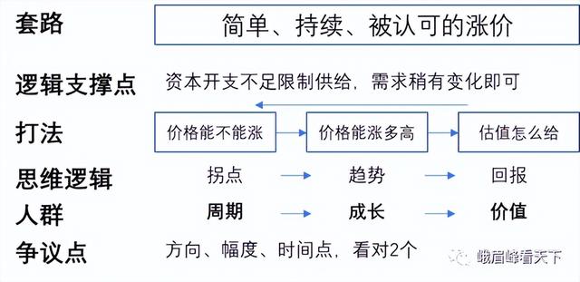 中间可按照权重自行搭配,一般好的涨价是简单、持续、被认可的,这样才容易不上火、少吵架、拔估值。周期人重拐点,轻估值;成长人重景气,轻壁垒;价值人重壁垒,轻拐点。这像一个循环,一个东西往往包含多面,周期股中后段定价往往不是周期思维,如锂vs新能源,煤炭vs消费,建材vs成长。说白了,还得多学习。