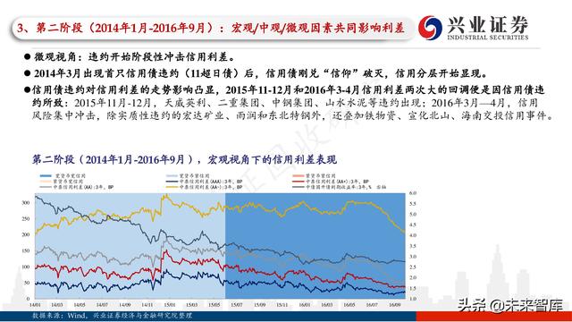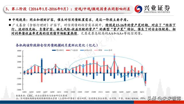 第二阶段(2014年1月-2016年9月):宏观/中观/微观因素开始共同影响信用利差变动。2014年末央行开启了 新一轮货币政策放松,同业和理财扩容,催生对信用债配置需求(中观视角),是这一阶段的主要矛盾,叠 加11超日债违约宣告信用债“刚兑”打破,宏观、中观、微观三因素开始共同影响信用利差变动。