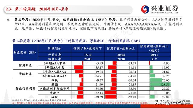 2)从信用扩张转向信用收缩阶段,信用利差多出现走阔,且随着信用收缩的深入,信用利差往往会在下一 个阶段(信用收缩 盈利向下)出现更明显的回调,等级利差走阔,高等级信用债往往更具有抗跌性。