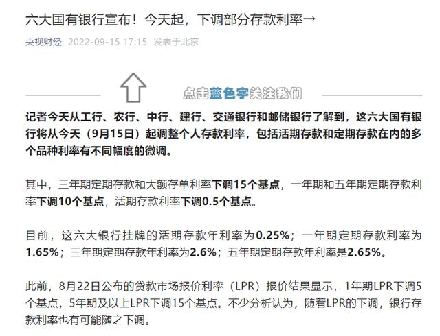 另外,据界面新闻报道,9月15日,中国工商银行、中国农业银行、中国建设银行、中国银行发布公告,下调各个期限的存款及大额存单利率。