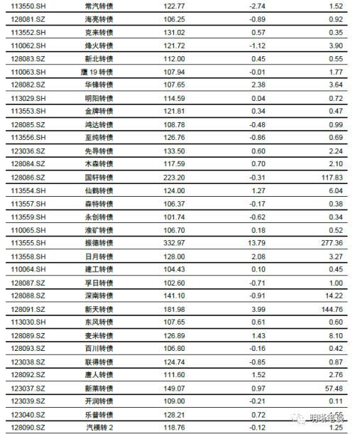 6月15日转债市场,平价指数收于100.97点,上涨0.08%,转债指数收于123.62点,上涨0.35%。254支上市可交易转债(辉丰转债除外),除久立转2、金轮转债、鼎胜转债和奇精转债横盘外,117支上涨,133支下跌。其中,振德转债(13.79%)、英科转债(12.79%)和尚荣转债(6.92%)领涨,万里转债(-4.41%)、精测转债(-4.02%)和百合转债(-3.95%)领跌。252支可转债正股(*ST辉丰除外),除桐昆股份、德尔未来、岱勒新材、中鼎股份、国祯环保和嘉澳环保横盘以外,95支上涨,151支下跌。其中搜于特(10.04%)、尚荣医疗(10.01%)和英科医疗(10.00%)领涨,利尔化学(-7.32%)、模塑科技(-6.30%)和梦百合(-6.03%)领跌。