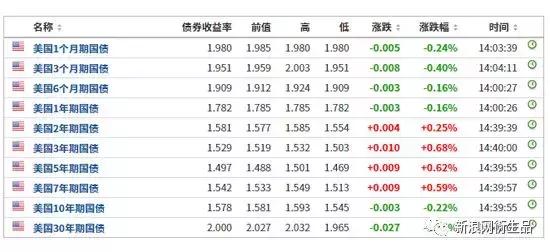 截止发稿,美国30年期国债2.000%>美国1个月期国债1.980%>美国3个月期国债1.951%>美国6个月期国债1.909%>美国1年期国债1.782%>美国2年期国债1.581%>美国10年期国债1.578%>美国7年期国债1.542%>美国3年期国债1.529%>美国5年期国债1.497%。