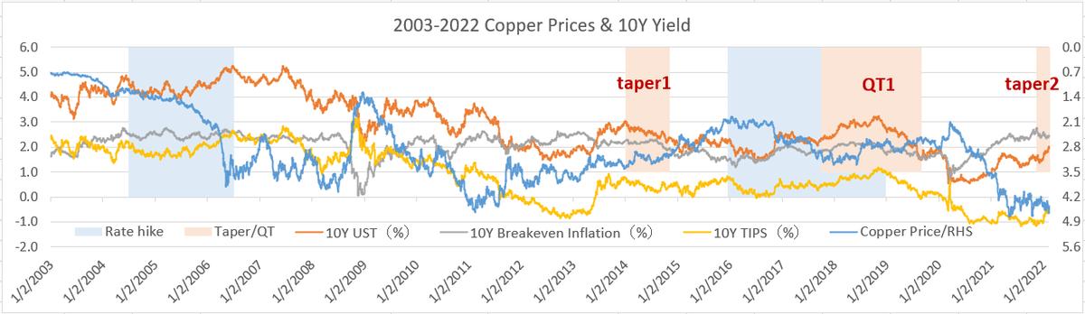 下图是2003-2022年间,铜价、10年期名义美债收益率、10年期盈亏平衡通胀率、10年期通胀保护债券(TIPS)收益率的历史趋势。