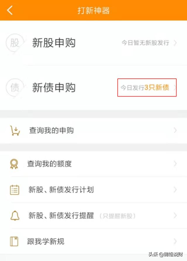点击“打新神器”,进入打新界面,点击“新债申购”,就能看到当天发行的新债了