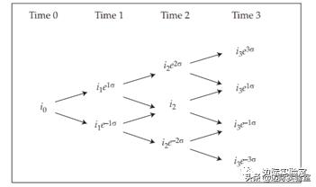 举个例子,假设i1,L是1.194%,σ是每年15%,然后i1,H = 1.194% (e2×0.15) = 1.612%。在Time 2时,一年期利率有三个可能的值,表示如下: