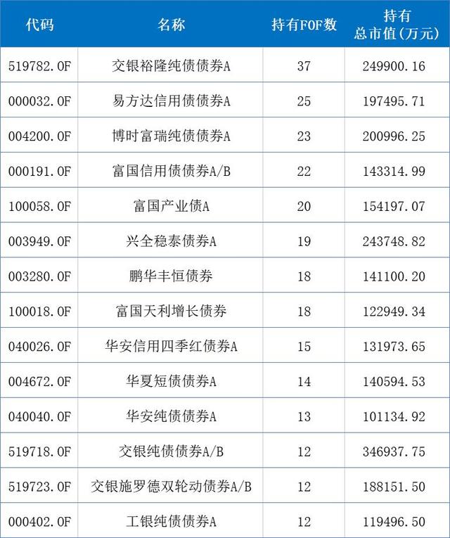 如果按持有FOF数排序,交银裕隆纯债A排第一位,被37只FOF持有;其次是易方达信用债A,被25只FOF持有;然后是博时富瑞纯债A、富国信用债、富国产业债,也被20多只FOF持有。