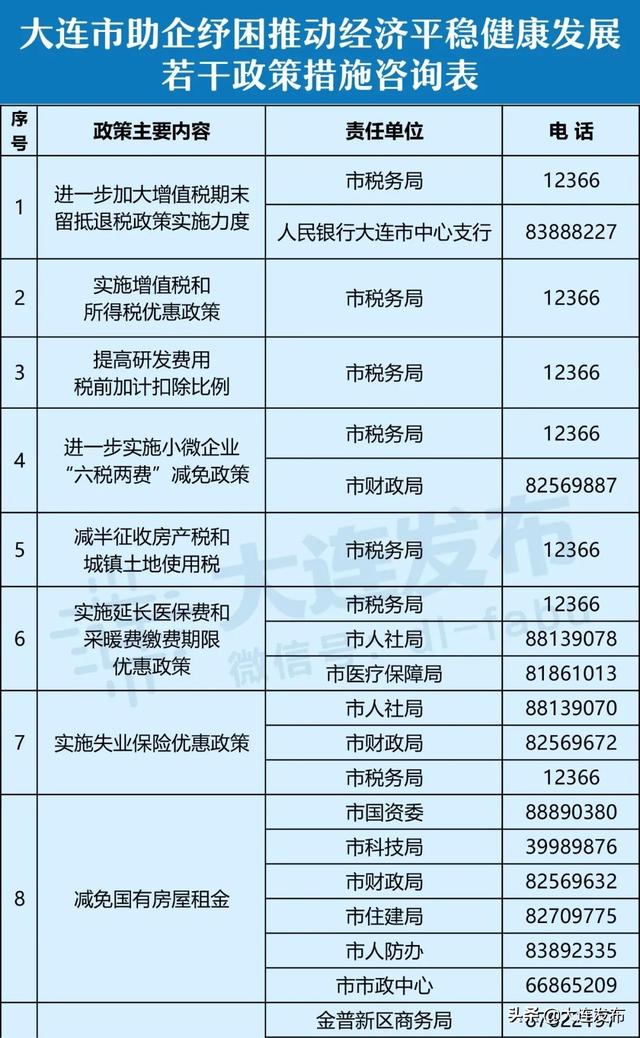 为统筹好疫情防控和经济社会发展,助力企业纾困解难,支持市场主体恢复发展,4月29日,我市出台了《大连市助企纾困推动经济平稳健康发展若干政策措施》(大政办发〔2022〕12号),包括普惠性纾困扶持措施19项,促进工业经济平稳增长措施7项,促进服务业恢复发展措施21项,合计47项。各项条款均明确了责任单位,并向社会公布了咨询电话。