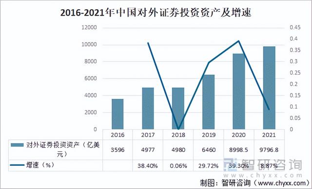 2021年,中国对外证券投资资产9796.8亿美元,较上年增加798.3亿美元,同比增长8.87%,其中投资中国香港4342.5亿美元,投资美国2044.6亿美元,投资开曼群岛830.1亿美元。