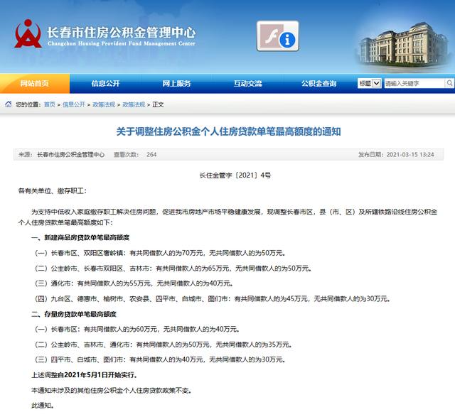 3月15日,长春市住房公积金管理中心发布公告,调整长春市区,县(市、区)及所辖铁路沿线住房公积金个人住房贷款单笔最高额度。
