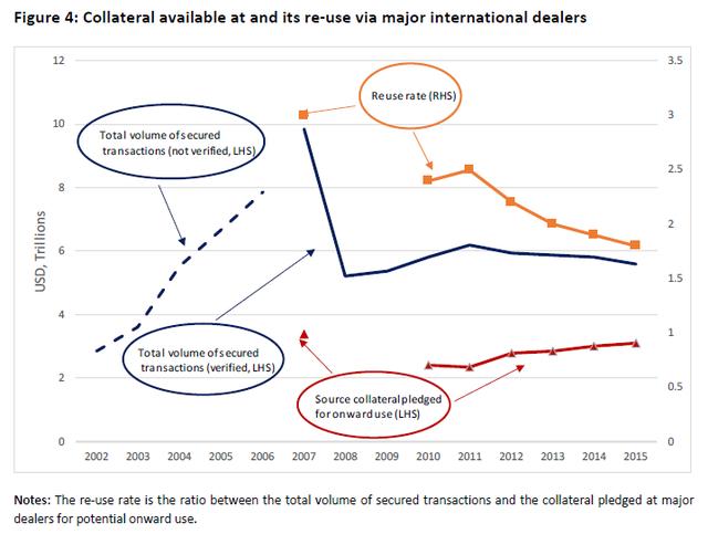 对国际抵押品速率 (collateral velocity) 或抵押品乘数 (collateral multiplier) 下降的一种解释是,金融危机之后,国际金融市场的“润滑”作用受到了影响,例如,获得有抵押融资的难易程度。具体来说,巴塞尔协议III要求银行持有最低数量的高质量流动资产 (HQLA),并限制杠杆率。两者都限制了交易商的资产负债表空间,并增加了抵押品后续使用的实际成本。