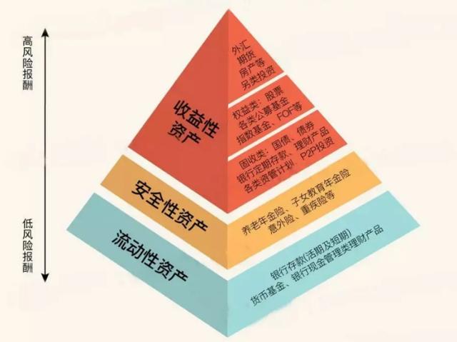 从“金字塔”的整体形状来看,底层最大,顶层最小,对应的我们的资产配置比例应该是低风险资产的比例最大,高风险资产的比例最小。