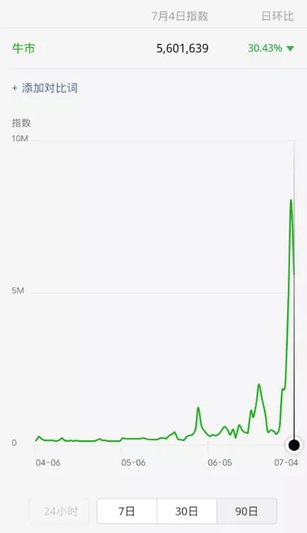 结果你们看到了,4-5月份的时候这个词的热度是10-20万,而在上周五这个词的热度飙升到了805万,话题热度瞬间涨了40倍。到7月5周日数据牛市热搜继续飙升到了900万 ,今天收盘后,可能会突破1000万 。