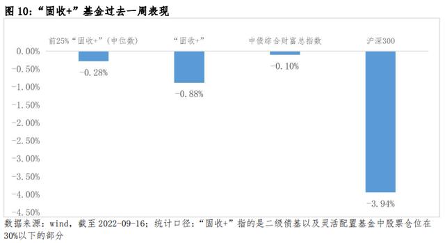 上周股市和债市均有所调整,“固收 ”产品净值有一定波动。全市场“固收 ”基金的平均收益为-0.88%,前25%的“固收 ”产品收益中位数为-0.28%,同期沪深300下跌3.94%,中债综合财富总指数下跌0.10%。