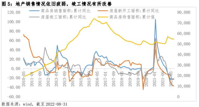 4)“宽信用”的核心仍在于地产,8月数据有小幅改观,但持续性仍有待观察: 8月商品房销售面积累计同比下滑23%,降幅仅较7月减少了0.1个百分点。销售情况尚未好转,销售回款低迷的情况下房企并没有充分扩大投资的意愿。1-8月新开工面积同比减少37.2%,购置土地面积同比减少49.7%,继续延续下滑趋势。竣工面积在去年高基数的情形下仍有一定收窄,8月的累计同比降幅还收窄了2.2个百分点,显现出“保交楼”的政策效用,但更关键的在于持续性,从竣工端优化传递到施工端整体优化的逻辑链很长:“竣工改善→居民信心提升→商品房销售改善→开发商销售资金来源优化→投资意愿增强”,链条的疏通需要一定的时间传导。