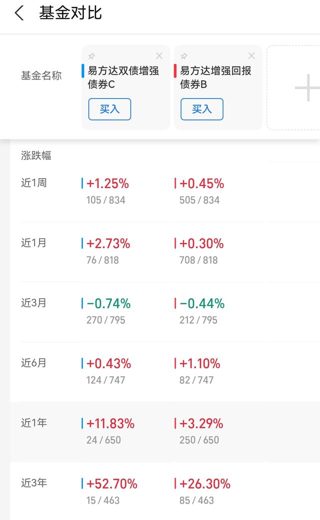 数据显示:近3月、近6个月涨幅 易方达增强回报债券B 跑赢 易方达双债增强债券C ,其余阶段均跑输双债增强。
