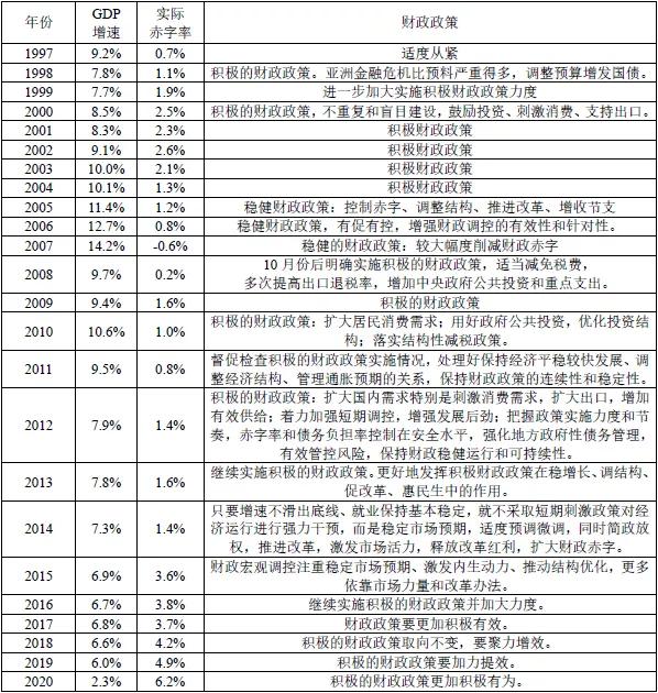 表2展示了我国1997年以来的财政政策。1998-2004年我国连续七年实施积极的财政政策,实际赤字率从1997年的0.7%上升到2002年的2.6%。在积极财政政策的带动下,基建持续发力并带动了制造业的高速增长,进而带动固定资产投资上升,中国经济增速从1998年的7.8%上升到2000年的8.5%及其后高达10%以上的增速。该阶段国债发行主要投向生产性支出的基建等领域,既改善了民生,又大幅降低了运输成本,提升了中国制造的全球竞争力,释放了中国经济高增长的巨大潜力。该阶段国债发挥了弥补赤字、筹集建设资金的功能,更重要的是还发挥了宏观调控刺激总需求的职能,同时实现了货币和财政政策的协调。