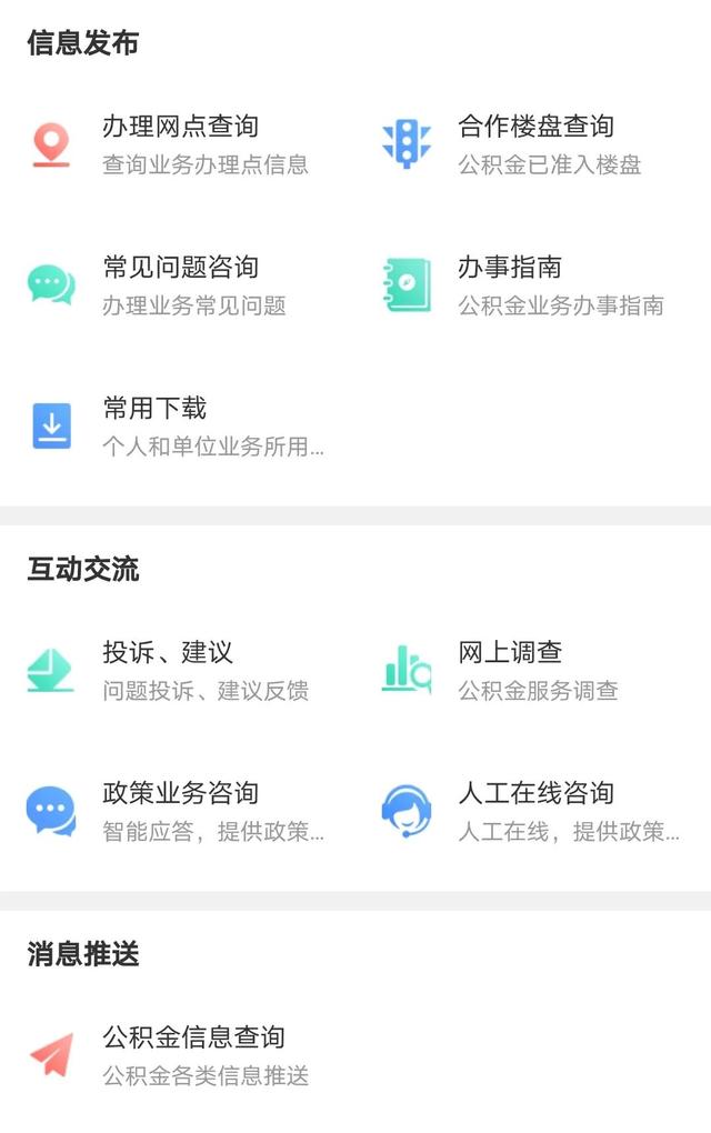 信息发布、互动交流与消息推送版块上线“常见问题咨询”“投诉建议”“网上调查”“公积金信息查询”等服务为你进行各类公积金信息推送及咨询服务!