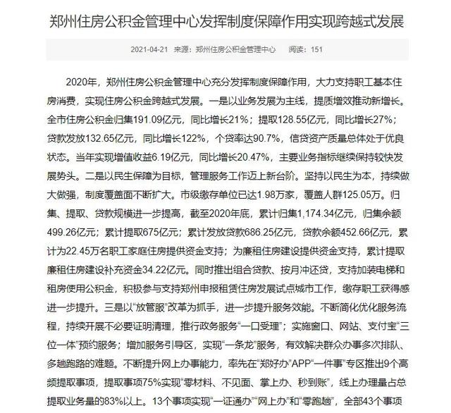 2020年,郑州住房公积金管理中心充分发挥制度保障作用,大力支持职工基本住房消费,实现住房公积金跨越式发展。一是以业务发展为主线,提质增效推动新增长。全市住房公积金归集191.09亿元,同比增长21%;提取128.55亿元,同比增长27%;贷款发放132.65亿元,同比增长122%,个贷率达90.7%,信贷资产质量总体处于优良状态。当年实现增值收益6.19亿元,同比增长20.47%,主要业务指标继续保持较快发展势头。二是以民生保障为目标,管理服务工作迈上新台阶。坚持以民生为本,持续做大做强,制度覆盖面不断扩大。市级缴存单位已达1.98万家,覆盖人群125.05万。归集、提取、贷款规模进一步提高,截至2020年底,累计归集1,174.34亿元,归集余额499.26亿元;累计提取675亿元;累计发放贷款686.25亿元,贷款余额452.66亿元,累计为22.45万名职工家庭住房提供资金支持;为廉租住房建设提供资金支持,累计提取廉租住房建设补充资金34.22亿元。同时推出组合贷款、按月冲还贷,支持加装电梯和租房使用公积金,积极参与支持郑州申报租赁住房发展试点城市工作,缴存职工获得感进一步提升。三是以“放管服”改革为抓手,进一步提升服务效能。不断简化优化服务流程,持续开展不必要证明清理,推行政务服务“一口受理”;实施窗口、网站、支付宝“三位一体”预约服务;增加服务引导区,实现“一条龙”服务,有效解决群众办事多次排队、多趟跑路的难题。不断提升网上办事能力,率先在“郑好办”APP“一件事”专区推出9个高频提取事项,提取事项75%实现“零材料、不见面、掌上办、秒到账”,线上办理量占总提取业务量的83%以上。13个事项实现“一证通办”“网上办”和“零跑趟”,全部43个事项实现“最多跑一次”。四是以着力防范化解风险为基础,确保资金运行安全。加强风险防控体系建设,围绕授权、用权、制权、监权等环节,查漏补缺,上线G系统联机反制模式,形成G系统关键要素变更审批流程等制度,切实防范业务风险。精简银行账户设置,清理销户各县(市)区银行专户13个,进一步提高资金使用效率和风险防控能力。加强逾期贷款的催收和处置,严控逾期率水平。常态化开展电子稽查和专项审计,有效防范和降低资金运营和管理风险。