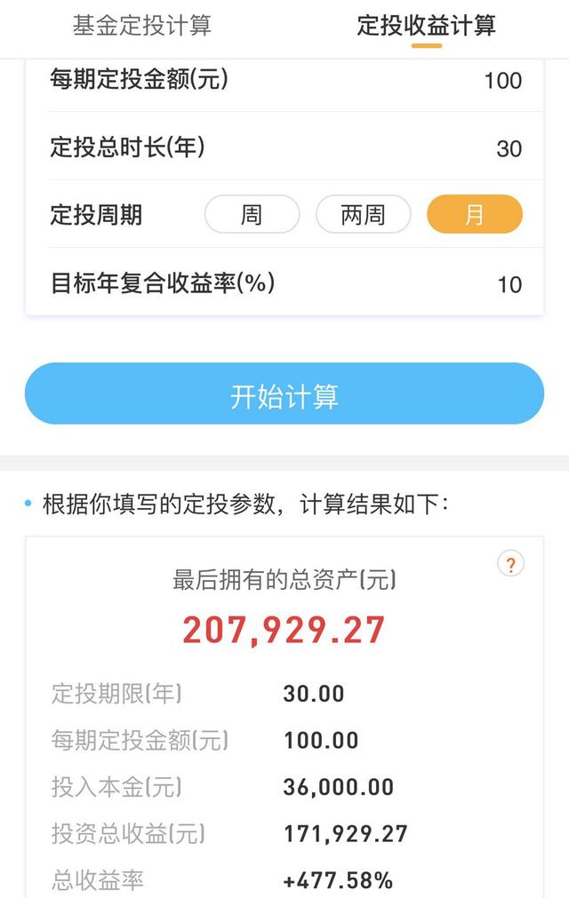 答案肯定会让你大吃一惊,那可是惊人的207929.27元。从这一方面来说投资100-200元,买基金肯定是非常有意义的了。