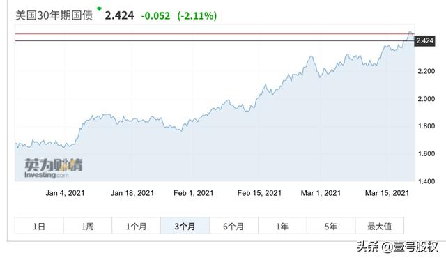 美国30年期国债收益率同样也是在大幅上涨,目前收益率为2.424%,快速上升的时间起点也是从1月底2月初开始的。