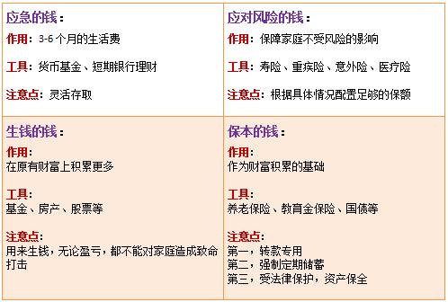一般我们会把家庭资产按照上表来配置,分成四个账户分别是:应急的钱、应对风险的钱、生钱的钱和保本的钱。